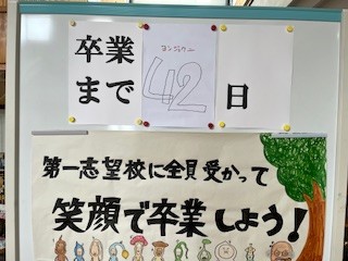 昨日から玄関に卒業までの「カウントダウンボード」が設置されました。この時期の恒例となっていますが、「もう、そんな時期か…」と、様々な思いがこみ上げてきます。