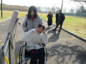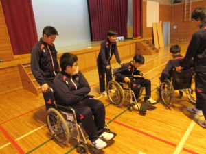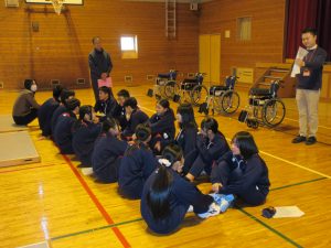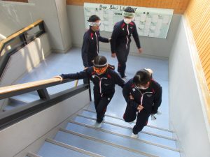 本日の2~4時間目にかけて、福祉体験学習を行いました。車椅子体験・ブラインドウォーク(視覚障害者体験)・高齢者体験を行い、大変さを実感していました。