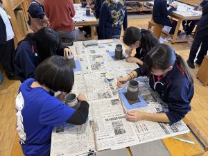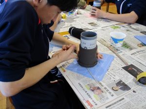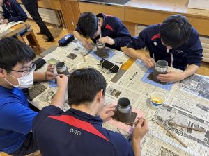 2日間の臨時休業が明け、開催が心配されましたが無事に「陶芸教室」が行われました。卒業を控えた3年生に向けた教室で、摩周多夢窯の平出さんを講師にお招きし行いました。