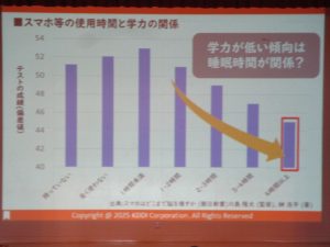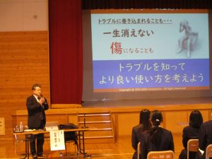 5時間目にKDDIから講師をお迎えして「携帯安全教室」を行いました。スマホだけに限らず、ネットでのさまざまなトラブルについて、アニメでわかりやすく表された事例「炎上」「依存」「出会い、犯罪」から、講話をいただきました。