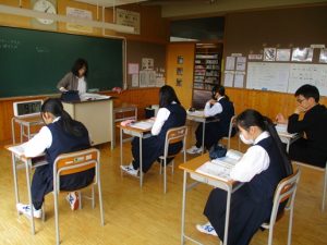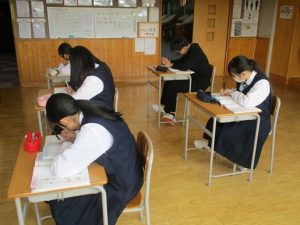 教頭先生の家庭科の授業です。「家族」についての学習でした。生徒たちは、真剣に話を聞きながら、大事なことや自分の考えなどをノートに書いていました。